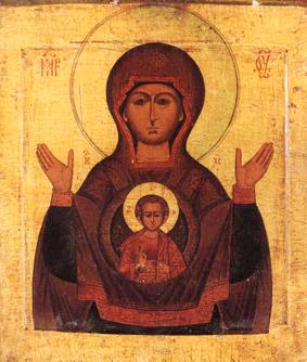 5) Икона "Знамения" Божией Матери, находящаяся в новгородском Знаменском монастыре. В первый раз она прославлена в 1169 г. по случаю нападения на Новгород бесчисленной рати Боголюбского. Не надеясь на собственные силы, новгородцы спешили только огородить свой город острогом и пламенно молились Господу и Его Пречистой Матери о помощи. На третью ночь архиепископ Иоанн во время молитвы услышал голос, который повелевал идти в церковь святого Спаса на Ильиной улице, взять оттуда икону Богородицы и вынести на городскую ограду. Архиепископ с наступлением дня послал было за иконою одного диакона с клирошанами, но икона не подвиглась с места. Потом отправился за нею сам со всем Собором и после всенародного молебствия икона подвиглась с места и была торжественно изнесена на городскую ограду. В это время суздальцы приступили уже к Новгороду и пустили на него целую тучу стрел. Икона чудесно обратилась лицом на народ, и архиепископ увидел текшие из очей Богоматери слезы, которые все приняли за знамение Ее небесной милости. Действительно, на суздальцев напал внезапный страх и слепота, они начали биться между собою, и новгородцы, вышед из-за ограды, стремительно ударили на них, одних истребили, других прогнали, третьих взяли в плен. С того времени икона прославилась и другими чудесами.
