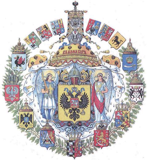 §1. Российский Государственный герб есть в золотом щите черный двоеглавый орел, коронованный двумя Императорскими коронами, над которыми третья такая же, в большем виде, корона с двумя развевающимися концами ленты ордена Святого Апостола Андрея Первозванного. Государственный орел держит золотые скипетр и державу. На груди орла герб Московский: в червленом с золотыми краями щите Святой Великомученик и Победоносец Георгий в серебряном, покрытом багряной тканью с золотой бахромой коне, поражающий золотого с зелеными крыльями дракона золотым с осьмиконечным крестом на верху копьем. Главный щит (с гербом Государственным) увенчан шлемом Святого Великого Князя Александра Невского. Намет черный с золотом. Вокруг щита цепь ордена Святого Апостола Андрея Первозванного; по сторонам изображения Святых Архистратига Михаила и Архангела Гавриила. Сень золотая, коронованная Императорской короной, усеянная Российскими двоеглавыми орлами, и подложена горностаем. На ней червленая надпись: С нами Бог! Над сенью возникающая государственная хоругвь с осьмиконечным на древке оной крестом. Полотно Государственной хоругви золотое; на ней изображение среднего Государственного герба, только без окружающих оный девяти щитов.