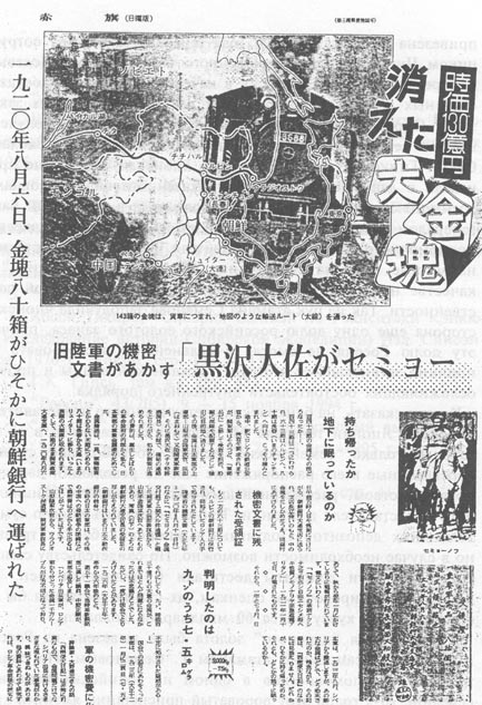 35 ]С этими данными перекликается и та подробная информация о получении японцами русского золота из рук Семенова, которую сообщила своим читателям японская газета “Акахата”. Ниже привожу с небольшими сокращениями содержание статьи Томаки Абэ, опубликованной в названной газете 11 сентября 1977 года под заголовком: “Исчезнувшие слитки золота. Их нынешняя цена 13 миллиардов иен. 143 ящика были отправлены как груз военного назначения”.